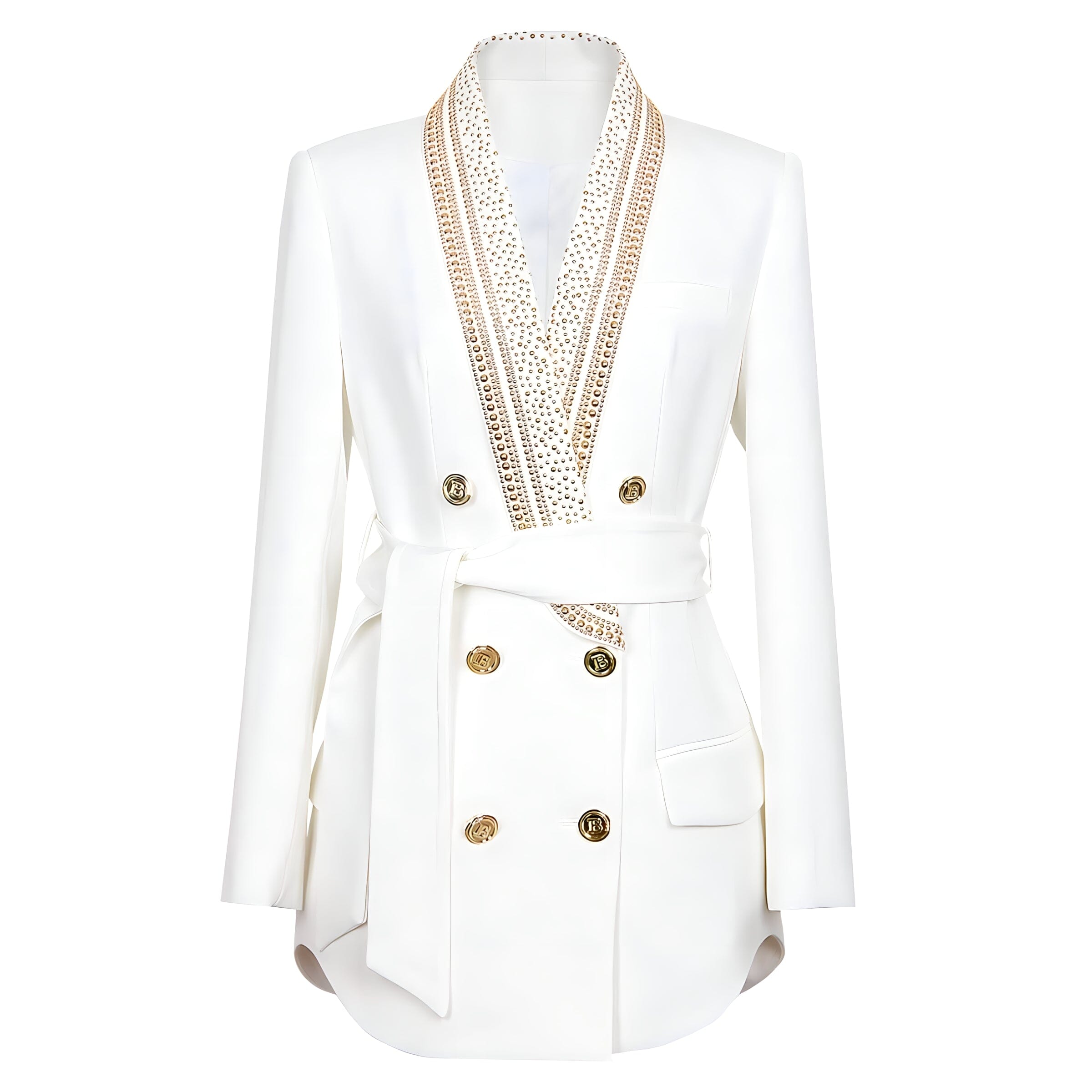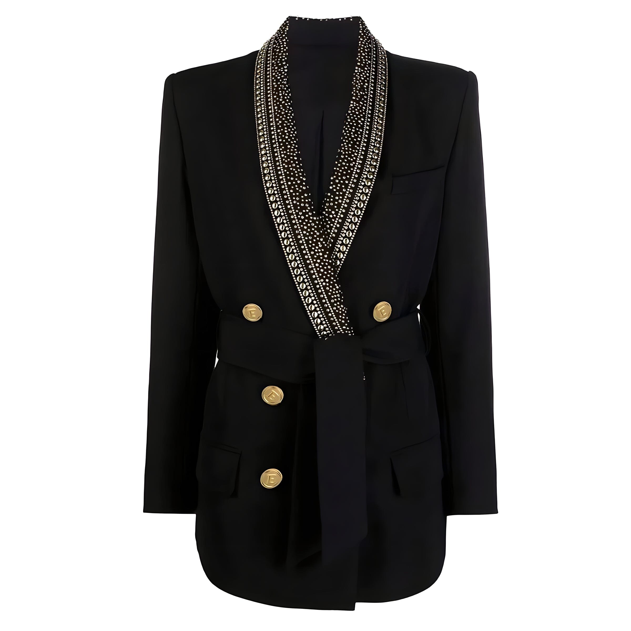 Intricate design and detailed construction make the blazer an instant wardrobe essential. Featuring a premium polyester-cotton fabric blend, sequin accented shawl collar, and decorative mid-drift sash for a look you won’t find anywhere else. Functioning either as an oversized blazer or alluring mini-dress, you won’t want to leave home without this.